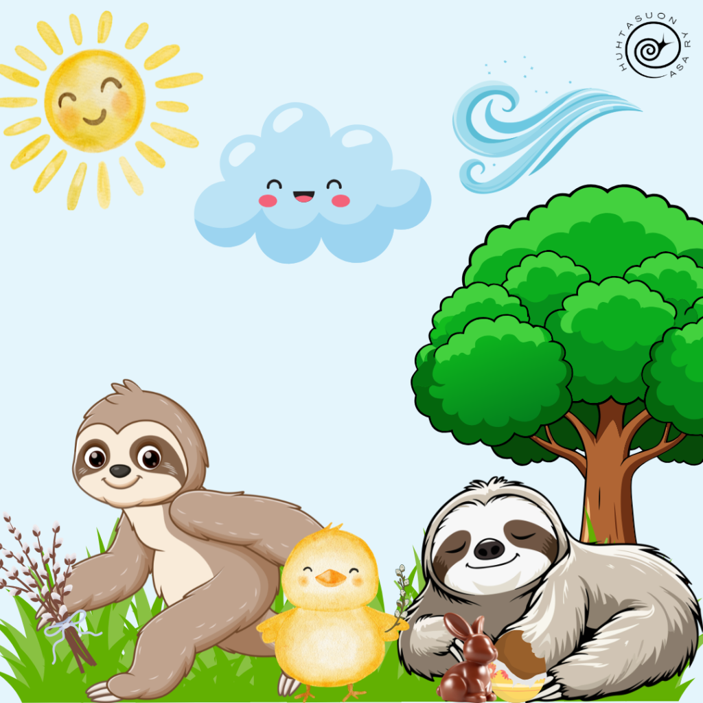 Sepe oli kuullut, että pääsiäisenä syödään lammasta ja sen kanssa kermaperunat ja salaatti varmasti maistuu hyvältä. Kun hän on laiskiainen niin oli parasta tilata ruuat valmiina kotiinkuljetuksella. Sillä laiskiaiset nukkuvat todella paljon. Jälkiruuan hän myös tilasi, tällä kertaa persikka-rahkapiirakkaa. Ja kahvia Sepellä oli kotona. Ruokaa oli runsaasti, joten sitä riitti koko pääsiäiseksi. Joten hän saattoi laiskotella ja katsella telkkaria. Sen mitä nukkumiselta jaksoi. Yhtäkkiä Sepe muisti suklaamunat ja karkit, mitkä oli saanut virpomispalkaksi. Ja eikun herkuttelemaan, mutta tällä kertaa kohtuudella. Sepen pääsiäinen oli rento ilman aikatauluja, ja siitä hän nautti ihan täysillä.