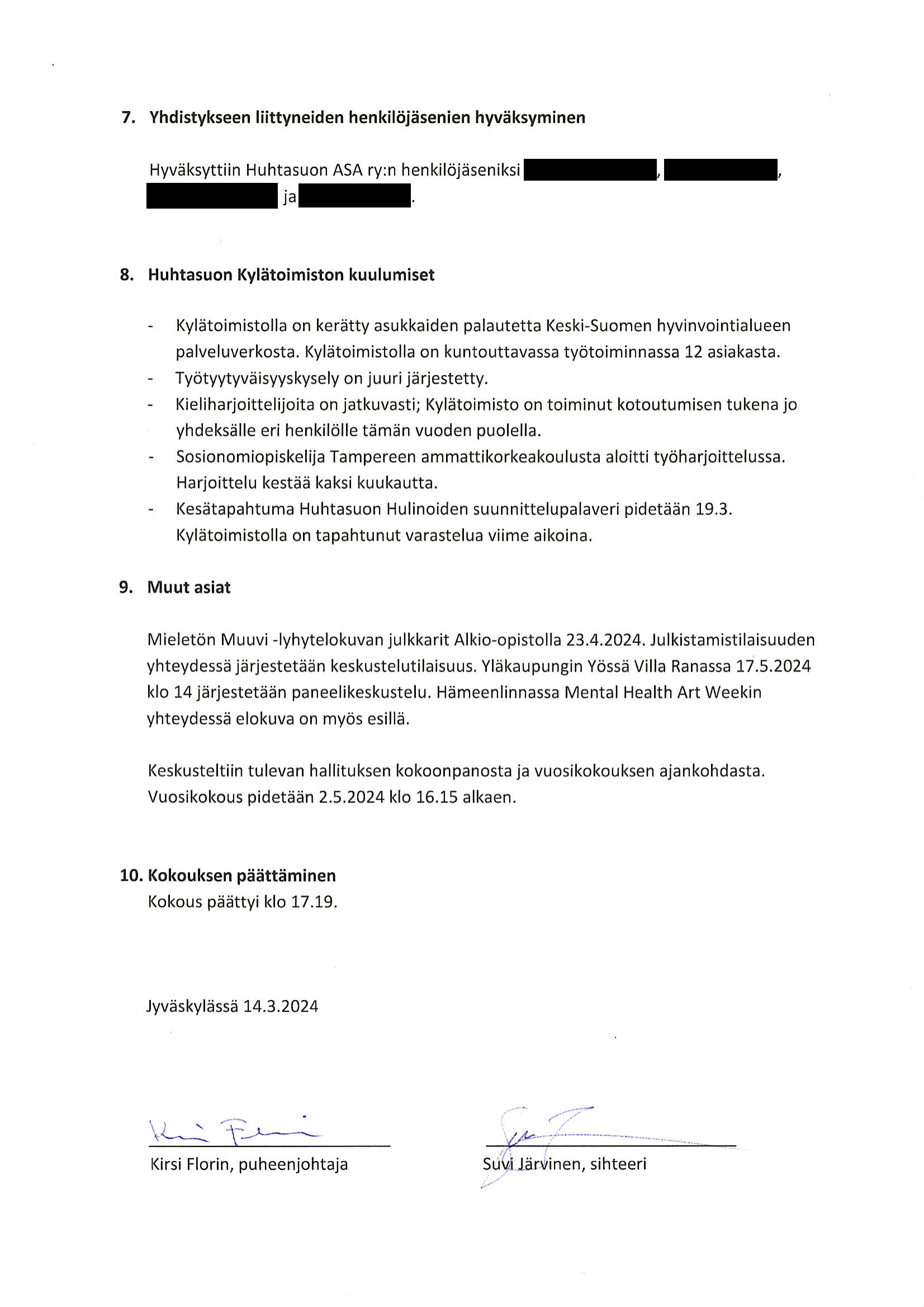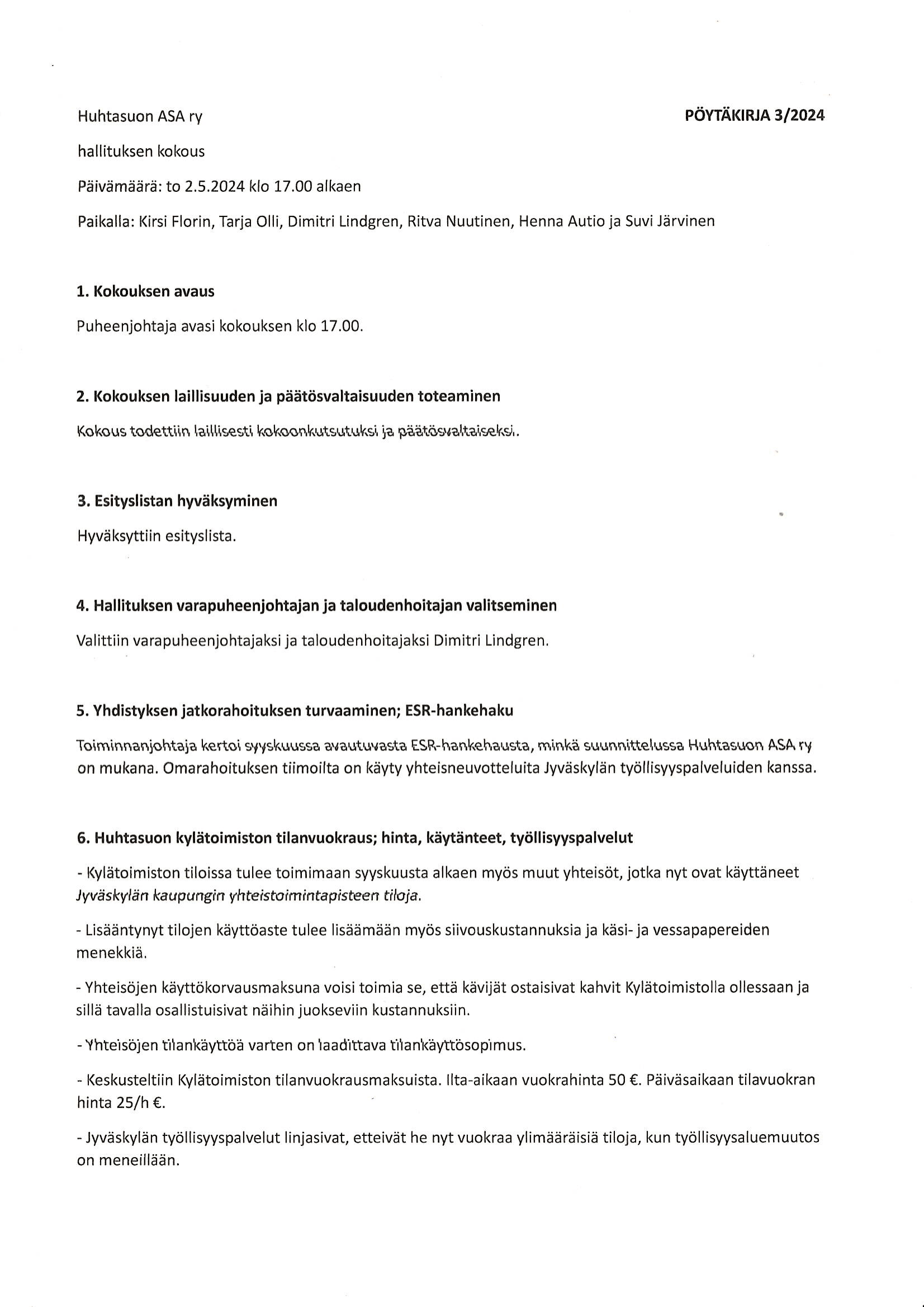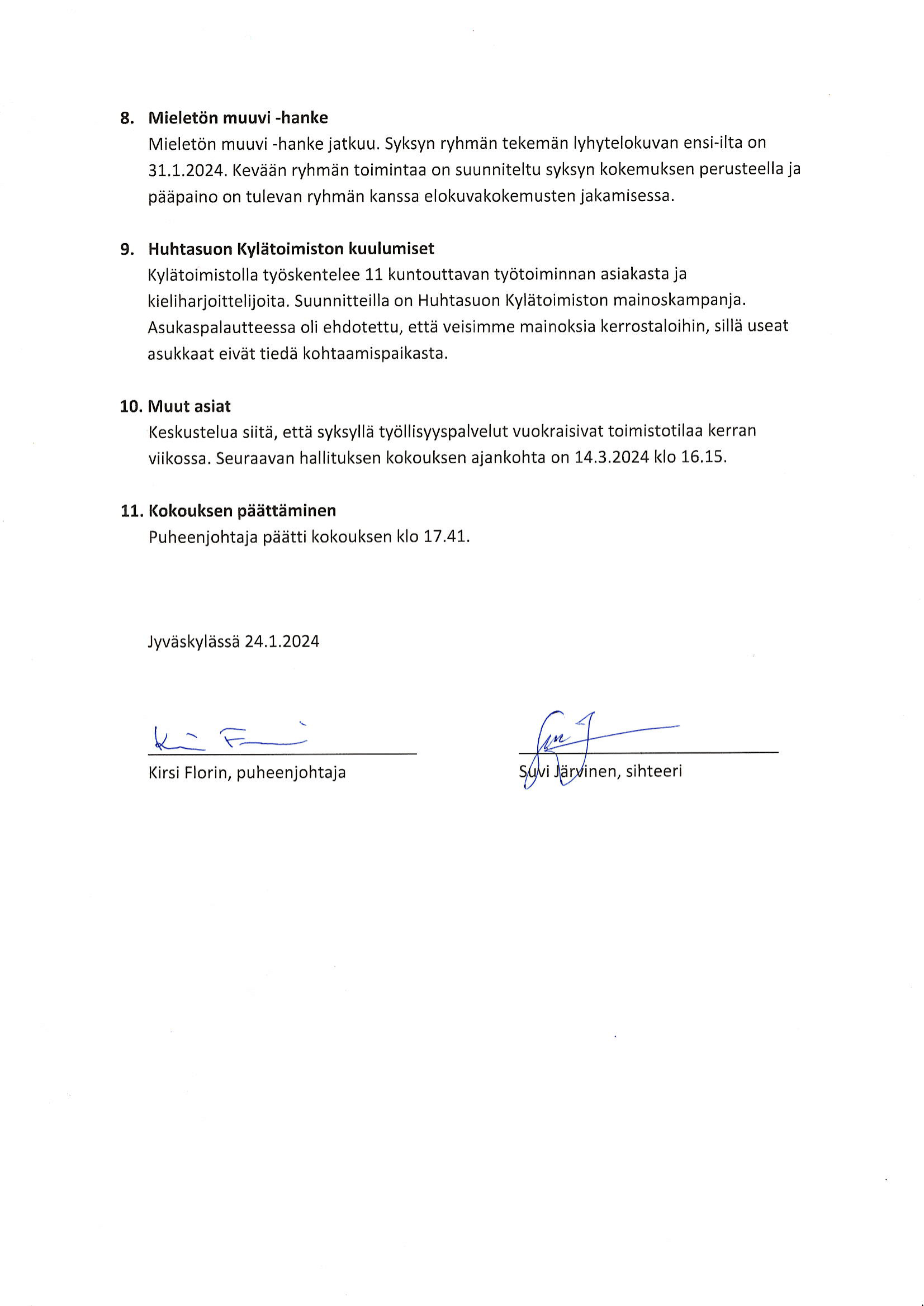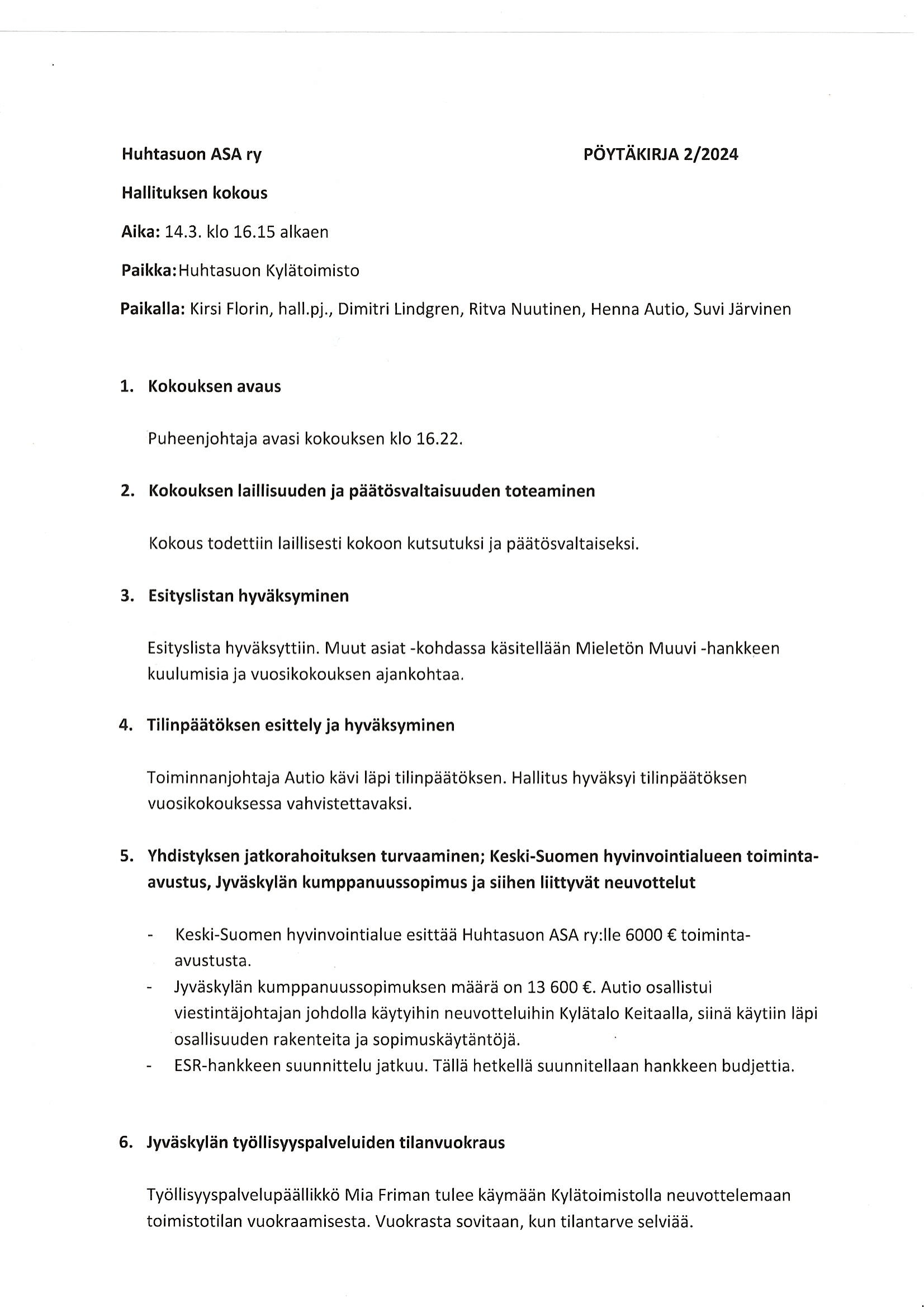 Sähköpostikokous, luettavissa Huhtasuon Kylätoimistolla.