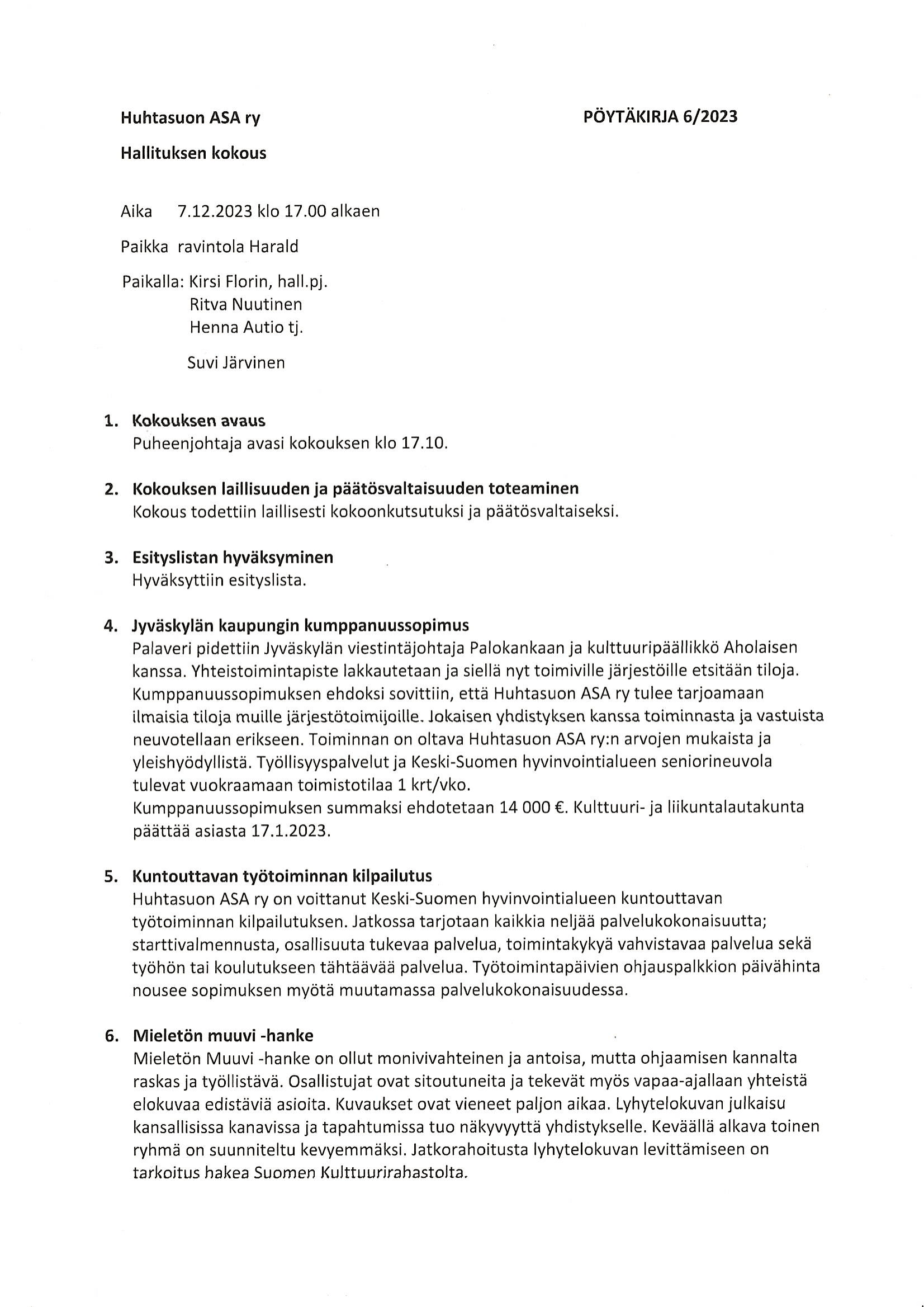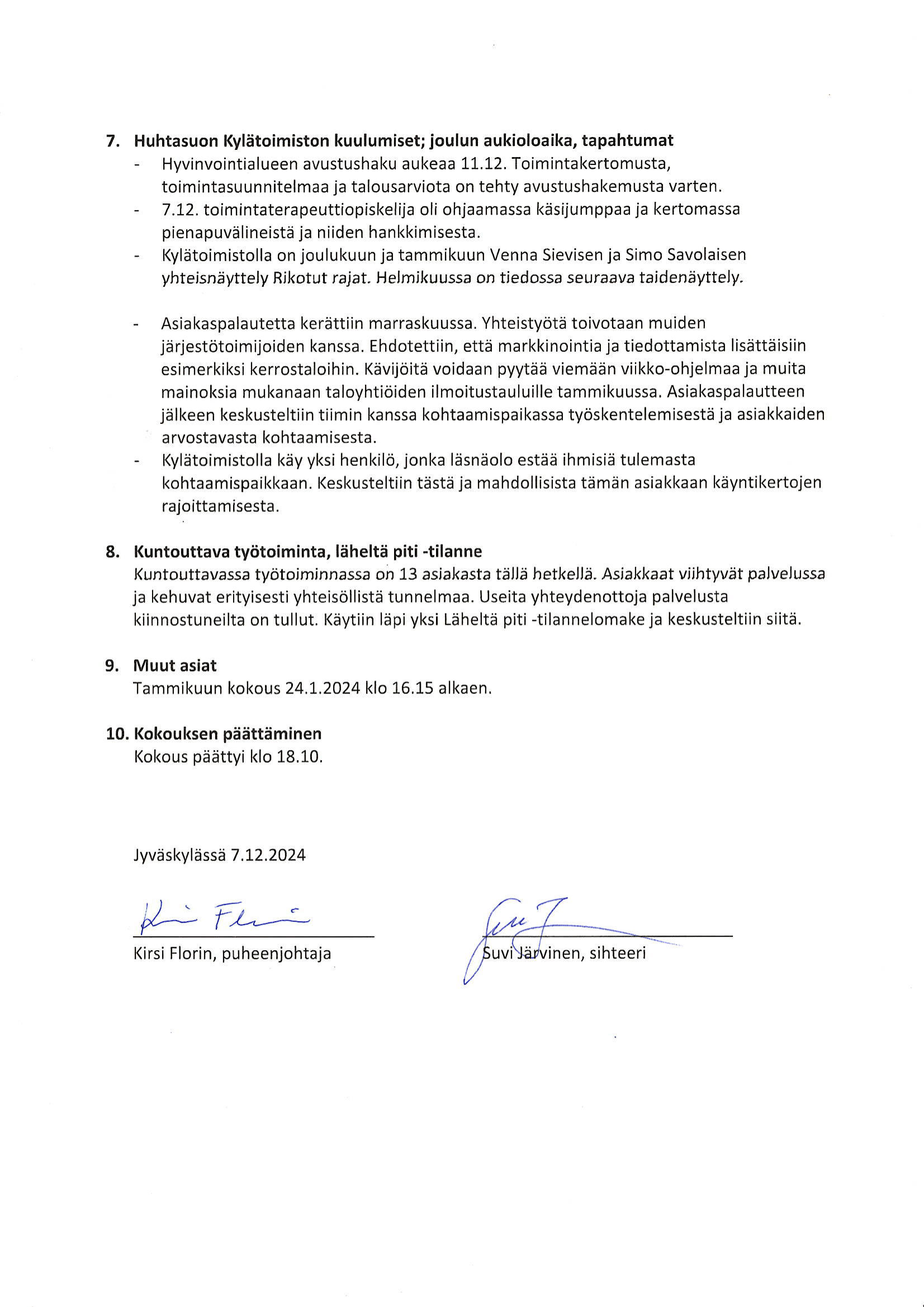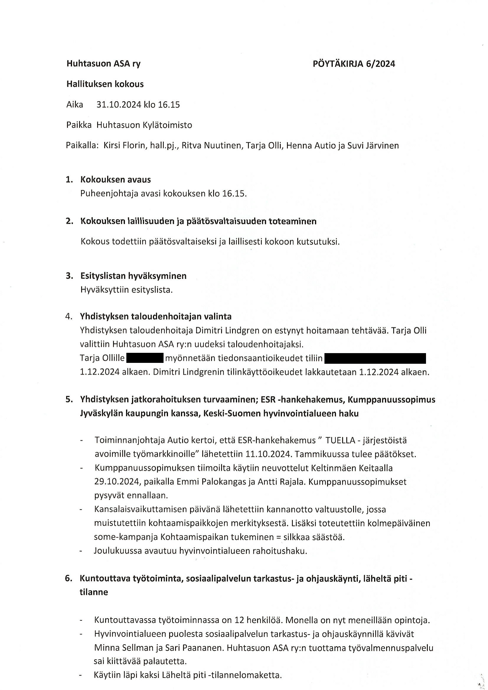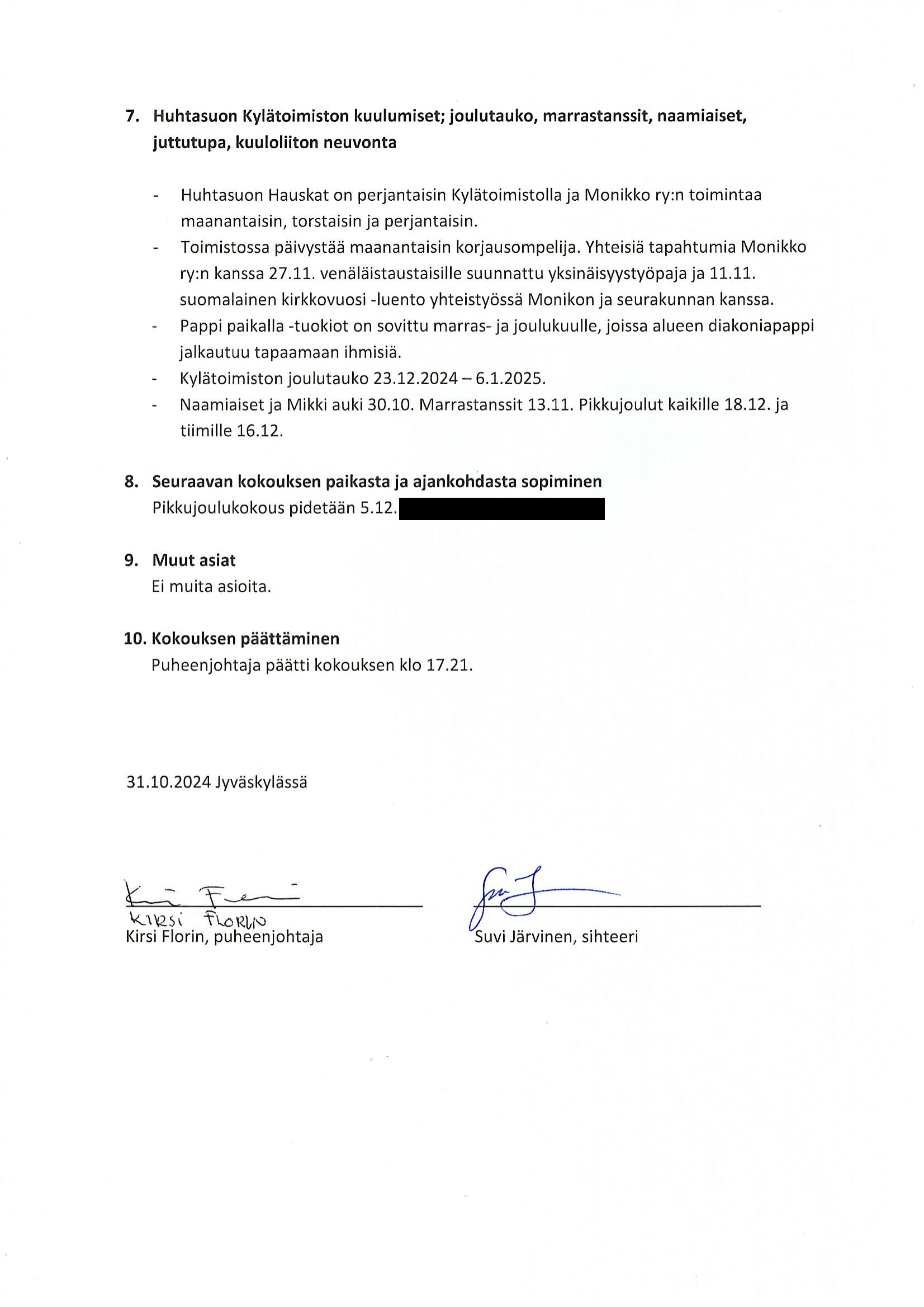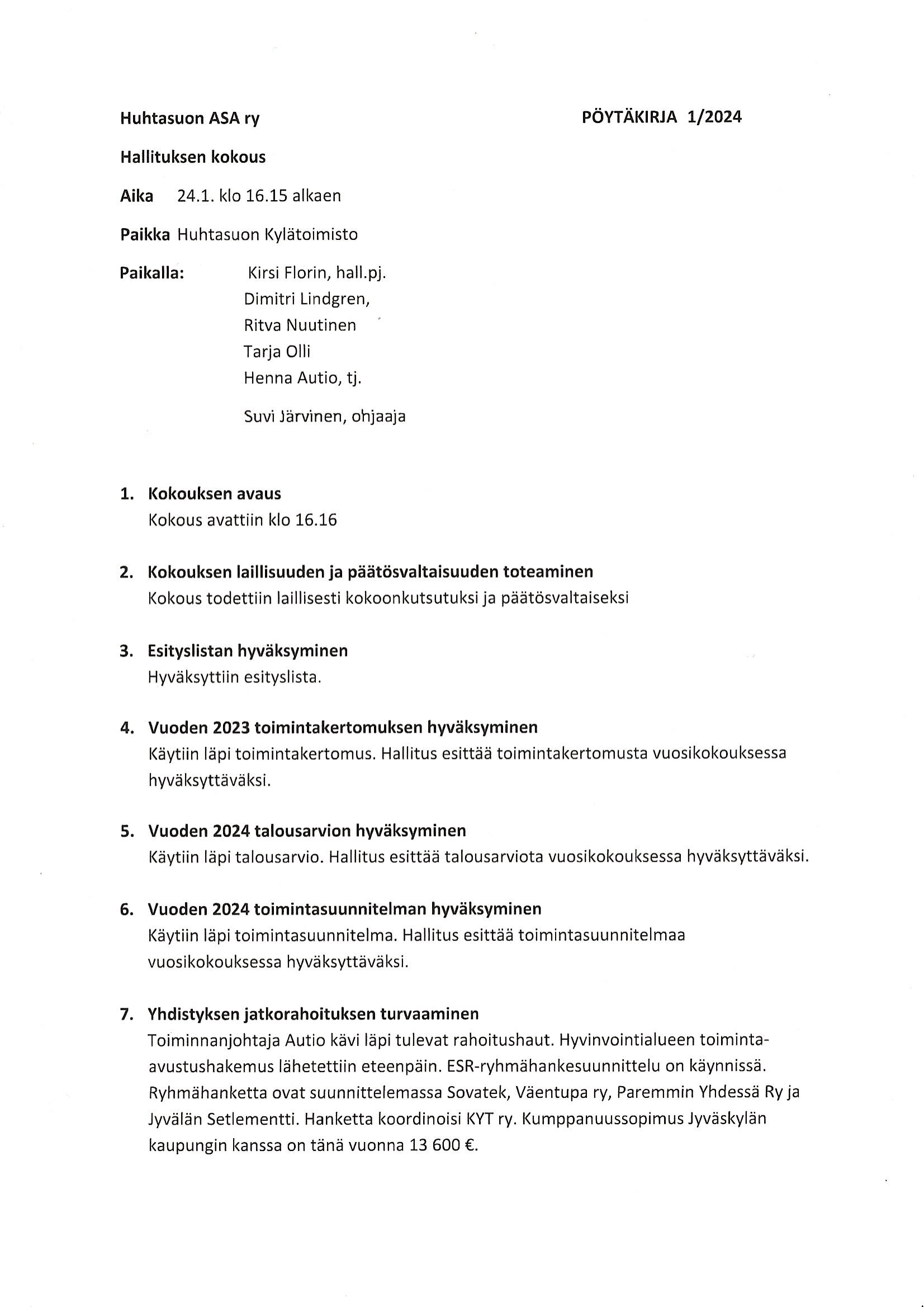 Sähköpostikokous, luettavissa Huhtasuon Kylätoimistolla.