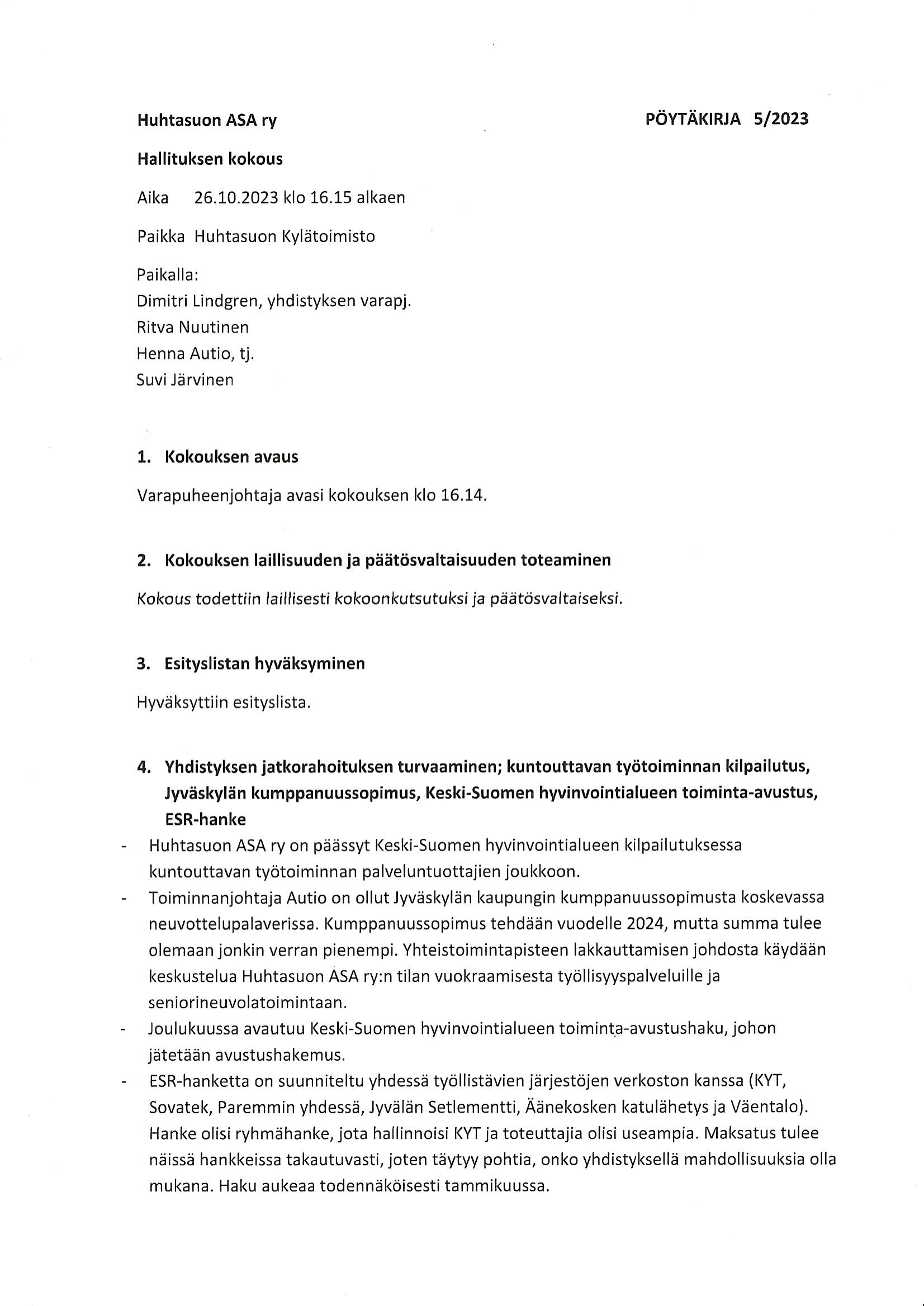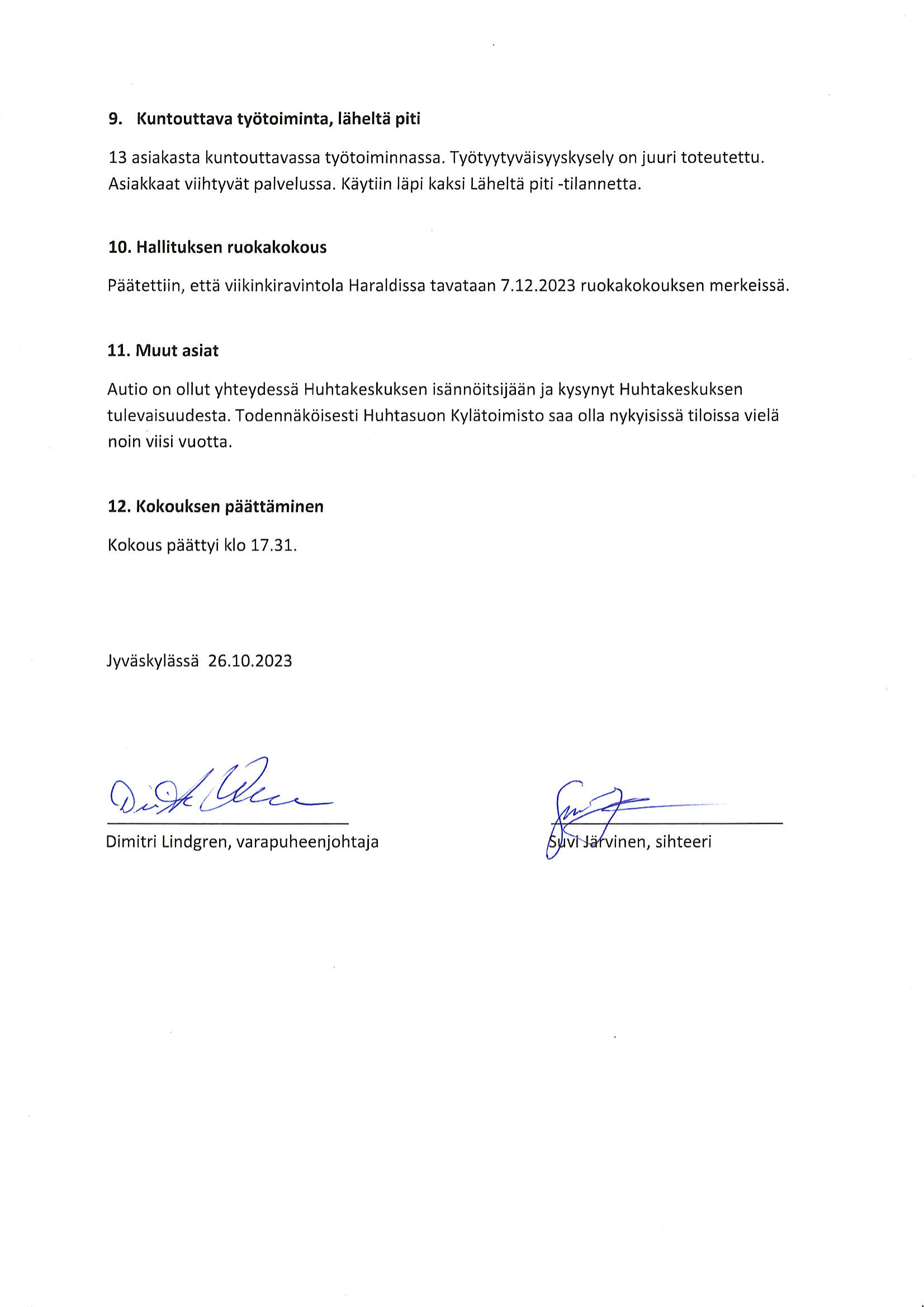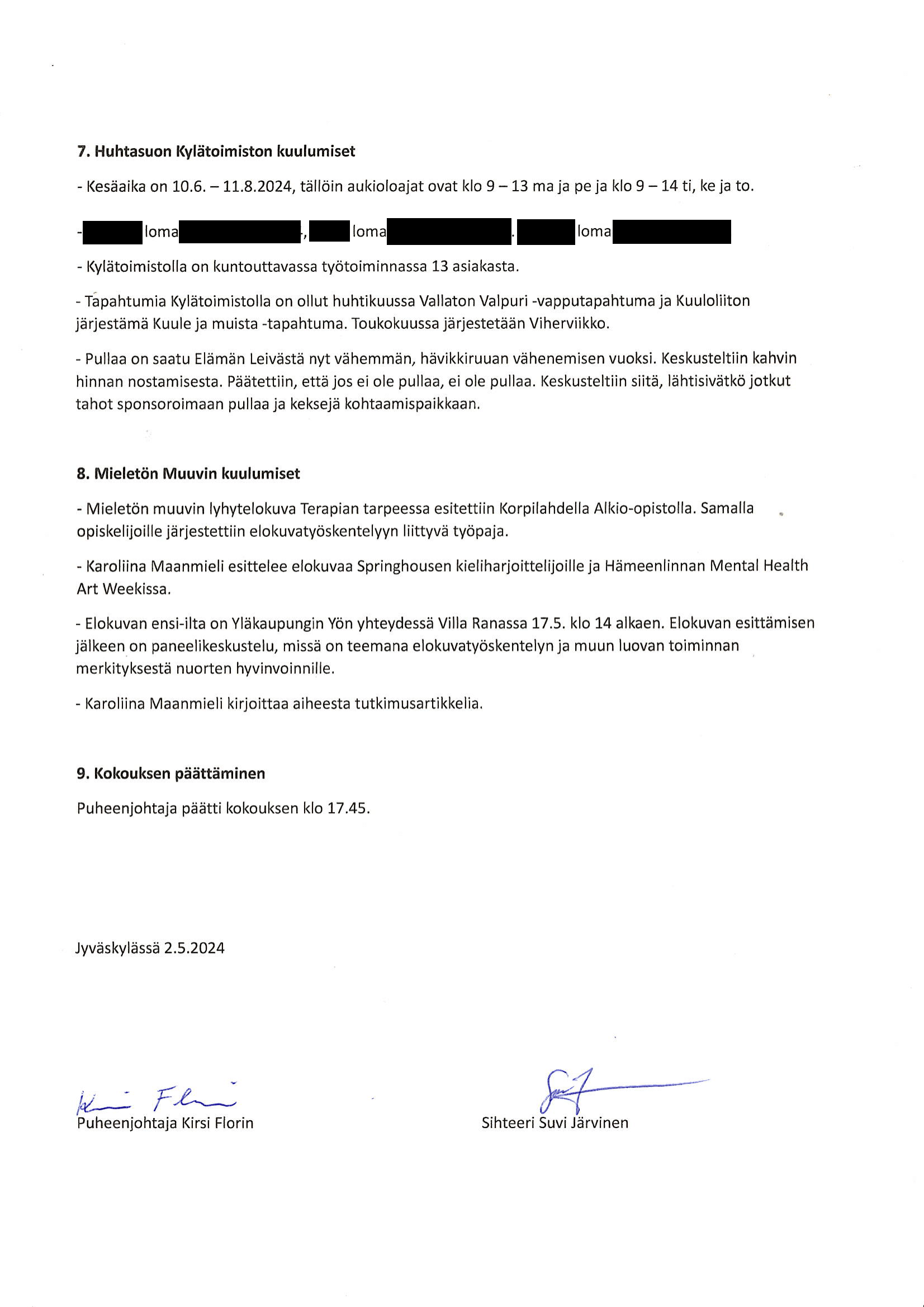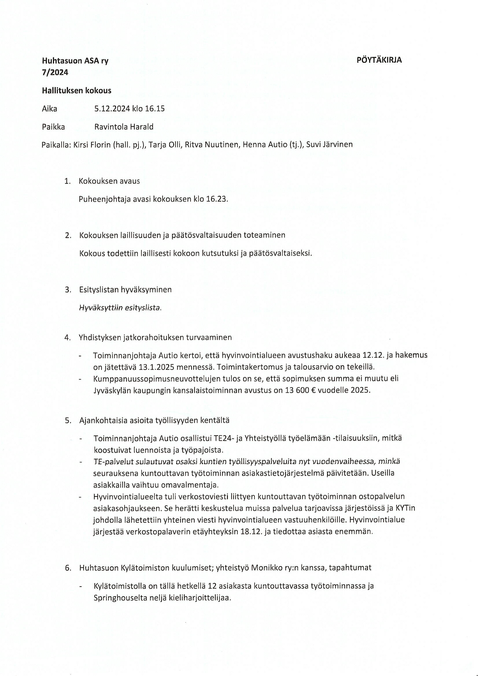 Sähköpostikokous, luettavissa Huhtasuon Kylätoimistolla.